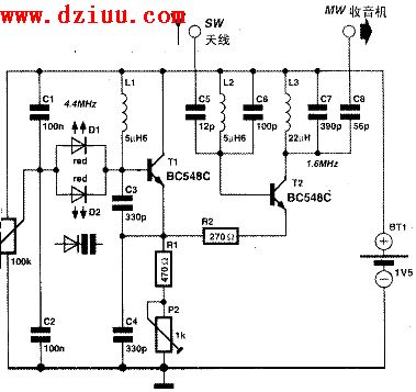 第2只管子構成混頻級。諧振電路的頻率在天線電路是6.7MHz,在輸出電路為1.7MHz。晶體管結電容和耦合電容的作用使每一回路的諧振頻率降低。
