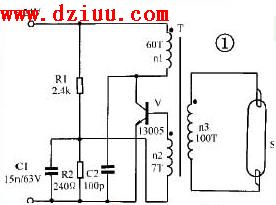 圖中R1為啟動電阻使開始時電路能正常工作。電阻R2為偏流電阻,向三極管V提供一個合適的基極電流。電容C1為加速電容,用于改善加在三極管V上的脈沖電壓波形。C2的作用是減少加在三極管集-射極上的尖峰電壓,防止三極管被擊穿。