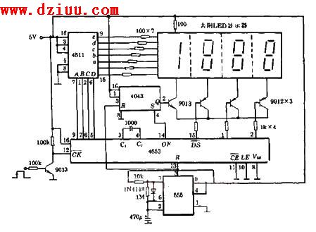 圖中,555用于定時復零,4553是十進三位CMOS計數器,4511是BCD碼七段譯碼器。《版權聲明:本文由www.6600560.cn整理提供,部分內容來源于網絡,如有侵犯到你的權利請與我們聯系更正。》