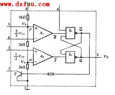 (1)分壓器 由三個(gè)5kΩ的電阻串聯(lián)組成分壓器,其上端接電源VCC(8端),下端接地(1端),為兩個(gè)比較器A1、A2提供基準(zhǔn)電平。使比較器A1的“+”端接基準(zhǔn)電平2VCC/3(5端),比較器A2的“-”端接VCC/3。