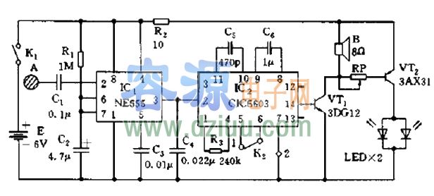 電路有一個單穩觸發器和語言集成音響電路組成。555和R1、C2等組成一個單穩觸發器,當來者觸及金屬片A時,555電路置位,3腳呈高電平,觸發IC2。《版權聲明:本文由www.6600560.cn整理提供,部分內容來源于網絡,如有侵犯到你的權利請與我們聯系更正。》