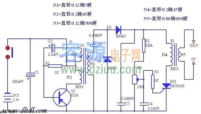 晶體管BG組成一個振蕩器,將1.5V直流電經T 1升壓、D整流、C3儲能后供可控硅自動放電回路。接通開關S后,C3兩端的電壓不斷的升高,當電壓升高至某一設定值時(