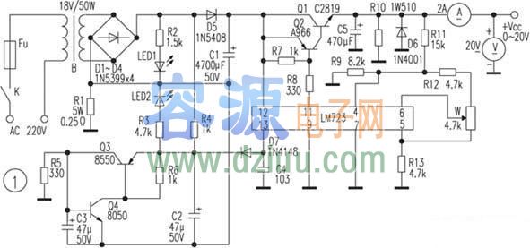 閃亮,調節電位器W可使輸出電壓在0~20范圍內調節。 <<版權聲明:本文由容源電子網(www_dziuu_com)整理提供,部分內容來源于網絡,如有侵犯到你的權利請與我們聯系更正。》