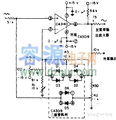 如圖為正弦波整形器電路圖。該電路用一只CA3140型雙MOS運算放大器做為電壓跟隨器,與若干二極管組成的CA3019陣列一起,將三角波信號轉成正弦波輸出信號。 <<版權聲明:本文由容源電子網(www_dziuu_com)整理提供,部分內容來源于網絡,如有侵犯到你的權利請與我們聯系更正。》