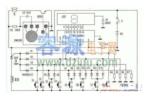 當按下復位鍵時。可控硅被切斷電源而截止,IC1的控制端則由高電平轉變為低電平而清零。為下一次搶答做準備。 <<提示:容源電子網為廣大電子愛好者提供電路圖專題網站“容源電路圖網”,歡迎訪問。匯聚大量電路圖與你共同分享。》