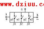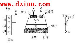 的管芯都是由P型硅和N型硅組成的四層P1N1P2N2結構。見圖1。它有三個PN結(J1、J2、J3),從J1結構的P1層引出陽極A,從N2層引出陰級K,從P2層引出控制極G,