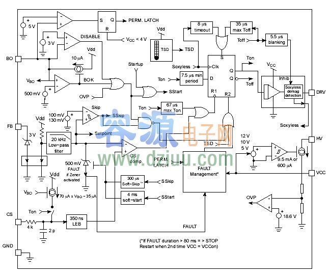 下面在為大家提供NCP1337P內(nèi)部電路圖   <<版權(quán)聲明:本文由容源電子網(wǎng)(www.6600560.cn)整理提供,部分內(nèi)容來源于網(wǎng)絡(luò),如有侵犯到你的權(quán)利請與我們聯(lián)系更正!