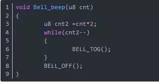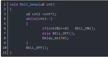 3)如果狀態變量為真:蜂鳴器先跳變Bell_Tog();當然如果沒有這個跳變函數也可以用上述的判斷cnt的方法,就不多寫了都是一樣的。同時次數自減BELL_CNT--;同時判斷是不是減到0了,減到0了說明響完了啊,那就把狀態變量賦值為假。再次進來不管蜂鳴器是開著的還是關著的都會執行關閉操作,這個跟上面說的保險一樣。