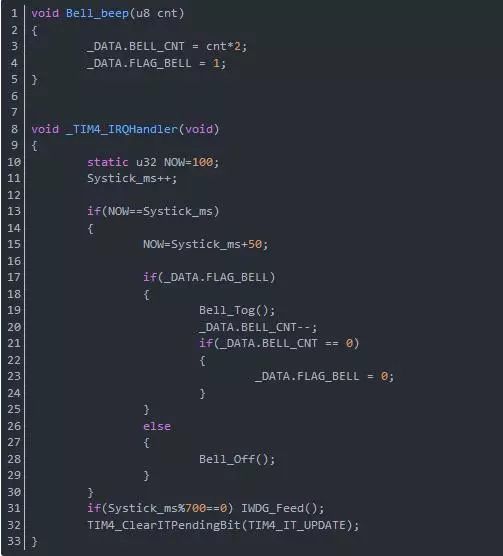 2、函數體變了,這里改成了兩個變量的賦值,第一個BELL_CNT同普通方法中的cnt2,這里不再贅述。第二個是FLAG_BELL是用來保存蜂鳴器是否需要驅動的狀態變量。所以既然是調用驅動函數,那肯定這個變量要為真。