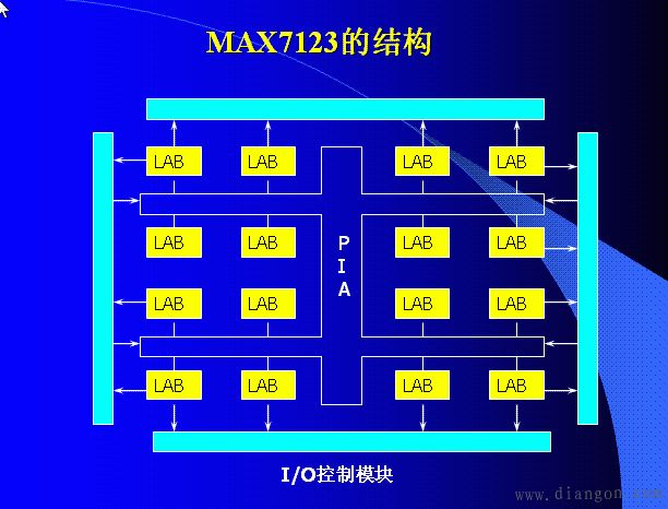 現在一般把所有超過某一集成度(如1000門以上)的PLD器件都稱為CPLD。CPLD由可編程邏輯的功能塊圍繞一個可編程互連矩陣構成。由固定長度的金屬線實現邏輯單元之間的互連,并增加了I/O控制模塊的數量和功能。可以把CPLD的基本結構看成由可編程邏輯陣列(LAB)、可編程I/O控制模塊和可編程內部連線(PIA)等三部分組成。