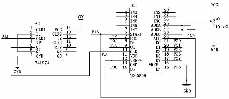 A/D轉(zhuǎn)換器的時(shí)鐘脈沖為單片機(jī)ALE引腳輸出的脈沖經(jīng)74LS74芯片分頻之后得到,A/D轉(zhuǎn)換器的8位數(shù)字信號(hào)通過(guò)單片機(jī)的P0口進(jìn)行采集與處理。