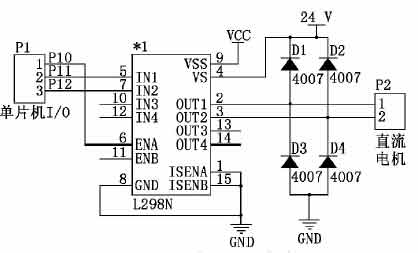 本系統(tǒng)選用的直流電機(jī)額定電壓為24V,額定功率為30W,單片機(jī)的I/O口不足以提供如此大的驅(qū)動(dòng)能力,故需采用驅(qū)動(dòng)電路。常用的直流電機(jī)驅(qū)動(dòng)芯片為L298N,可驅(qū)動(dòng)兩路直流電機(jī),最大驅(qū)動(dòng)電壓為46V,最大電流2A~3A,滿足設(shè)計(jì)要求。直流電機(jī)驅(qū)動(dòng)電路如圖5所示。