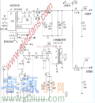 如圖所示為合并式單端A類電子管功放電路圖,本電路輸出功率:8W×2輸出阻抗:4Ω、8Ω輸入靈敏度:l.4V失真系數:2%頻率響應:25Hz-20kHz-3dB。電源功耗:120W。 :