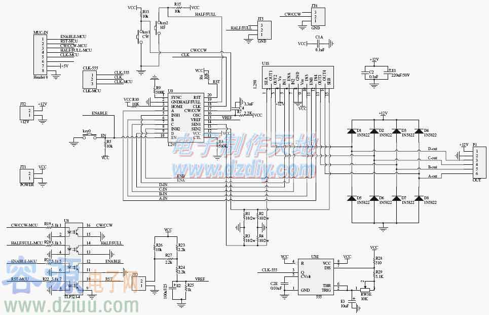 通過光藕隔離之后將CLK CW HF EN四個基本控制端引出單片機等可以非常方便的控制電路的工作這個板子改進的地方比較多也方便研究使用。板子使用1N5822快速二極管作為續流器件 其速度要遠遠快于整流橋的 L298和電機能夠提供更完善的有效的保護。模塊供電+5V(L297和L298控制供電) +12V(根據電機最低4V最高16V)給電機供電。