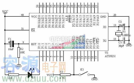 如圖所示,監視開關K1(接在P3.0端口上),用發光二極管L1(接在單片機P1.0端口上)顯示開關狀態,如果開關合上,L1亮,開關打開,L1熄滅。