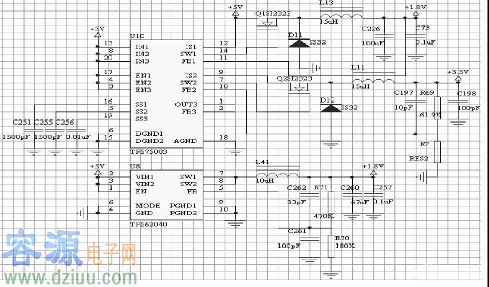 選用TI 公司的TPS75003 和TPS62040 電源管理芯片,TPS75003具有兩路最大提供3 A 的拓撲電源和一路300mA LDO 電源,每個Buck 輸出電壓范圍在1.2V 至6.5V 之間,LDO 輸出電壓范圍在0.9V 至