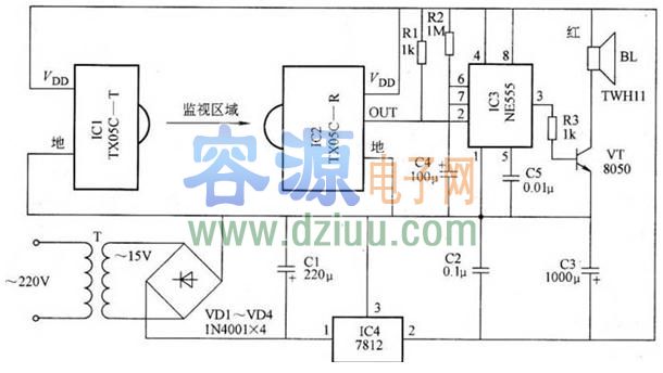 ,其電路主要由紅外發射和接收模塊、時基集成電路、報警揚聲器及電源電路幾部分組成。 <<版權聲明:本文由容源電子網(www_dziuu_com)整理提供,部分內容來源于網絡,如有侵犯到你的權利請與我們聯系更正。》