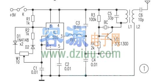 外圍元件構成晶體穩(wěn)頻電容三點式振蕩器,諧振頻率27.145MHz。VT1振蕩產生的高頻載波經(jīng)555③腳輸出的方波信號調制,由天線發(fā)射出去。 <<版權聲明:本文由容源電子網(wǎng)(www_dziuu_com)整理提供,部分內容來源于網(wǎng)絡,如有侵犯到你的權利請與我們聯(lián)系更正。》