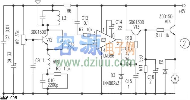 外圍元件構成超再生檢波器,檢出原方波調制信號,經(jīng)C12、R7送至IC2的③腳,放大后的信號經(jīng)D3、D4倍壓整流,由VT3射隨器輸出其平滑后的直流電壓。該電壓的大小與發(fā)送的不同占空比信號波形有關。 <<版權聲明:本文由容源電子網(wǎng)(www_dziuu_com)整理提供,部分內容來源于網(wǎng)絡,如有侵犯到你的權利請與我們聯(lián)系更正。》