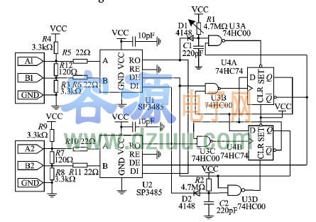 下,U1和U2將使其接收端輸出(RO)為高電平。 <<版權聲明:本文由容源電子網(www_dziuu_com)整理提供,部分內容來源于網絡,如有侵犯到你的權利請與我們聯系更正。》