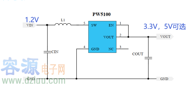 PW5100應用電路,1.2V升壓到3V和3.3V的升壓芯片