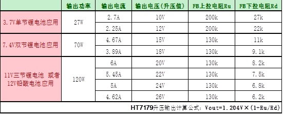 4.單節(jié)/雙節(jié)/三節(jié)鋰電或者鉛酸電池應用升壓輸出電壓/功率以及對應FB管腳設(shè)置電阻值: