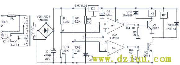 反之,如果電壓升高時,B點電壓也隨之升高,當B點電壓高于3V時,A2輸出低電平,V2截止,H2釋放,輸出端調至1、3頭;當市電電壓繼續升高時,A點電壓高于3V,A1輸出低電平,V1截止,K1釋放,輸出端調至1、2頭。A1、A2為運算放大器,在這里作電壓比較器用;IC1為三端穩壓塊,它為運算放大器及繼電器提供供電電源;VD5、VD6為保護二極管。