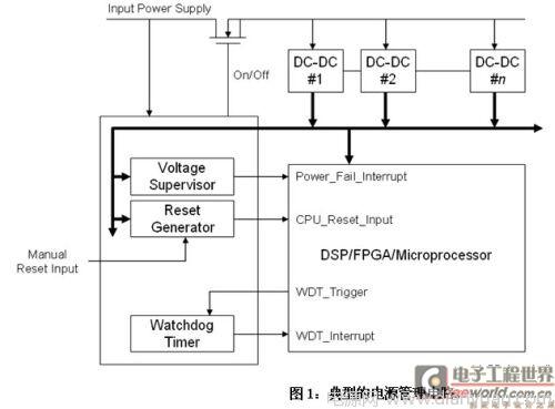 一個典型的CPU電源電路如圖1所示。對于典型的DSP、 FPGA或微處理器,各種電源電壓要求為:器件的核心電壓為1.2V、輔助電壓和PLL電壓為3.3V、 I/O驅動電壓為1.5V和1.8V。常見的電源設計的電壓是源于單一的5V輸入電源,通過一系列DC/DC轉換器后產生各種電源電壓。為提供如同單電源印刷電路板一樣的可靠性,必須對電路板上的所有電源進行監測,并能產生正確的CPU復位信號或電源故障中斷信號。