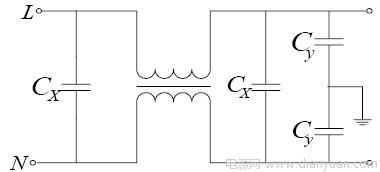 電源濾波器安裝在電源線與電子設(shè)備之間,用于抑制電源線引出的傳導(dǎo)干擾,又可以降低從電網(wǎng)引入的傳導(dǎo)干擾,對(duì)提高設(shè)備的可靠性有重要的作用。開(kāi)關(guān)電源產(chǎn)生的電磁干擾以傳導(dǎo)干擾為主,而傳導(dǎo)干擾又分差模騷擾和共模干擾兩種。構(gòu)成開(kāi)關(guān)電源EMI濾波器的基本網(wǎng)絡(luò)如圖1所示。該濾波器由共模扼流圈L、差模電容Cx和共模電容Cy組成。共模扼流圈L由兩個(gè)繞在同一個(gè)高磁導(dǎo)率磁芯上的繞組構(gòu)成,其結(jié)構(gòu)使差模電流產(chǎn)生的磁通相互抵消。這種結(jié)構(gòu)以較小體積獲得較大的電感值,并且不用擔(dān)心由于工作電流導(dǎo)致飽和。每個(gè)繞組與電容Cy分別組成L-E和N-E兩對(duì)獨(dú)立端口的低通濾波器,形成共模濾波網(wǎng)絡(luò),用來(lái)抑制電源線上存在的共模干擾。至于共模扼流圈L、差模電容Cx和共模電容Cy的取值大小,應(yīng)盡量做到濾波器的諧振頻率低于開(kāi)關(guān)電源的工作頻率,這樣可以實(shí)現(xiàn)對(duì)整個(gè)頻段的濾波。