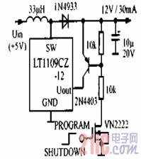 3V/12V DC/DC變換電路:LT1109為三端器件,沒(méi)有關(guān)閉電源控制端。若外接一些元件可組成有關(guān)閉功能的電路。FET的柵極為低電平時(shí),電源關(guān)閉,靜態(tài)電流等于零。 :