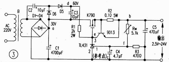 管(可直接并聯(lián)使用)以及C5是輸出濾波器電路等。穩(wěn)壓過(guò)程是:當(dāng)輸出電壓下降,F(xiàn)點(diǎn)肯定會(huì)下降,TL431放大后E點(diǎn)電壓就會(huì)上升,K790