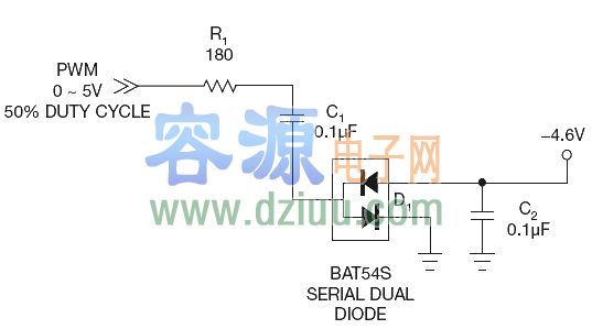 ,用一只BAT54S雙串聯(lián)肖特基二極管、兩只電容以及一只限流電阻構成的PWM電壓轉換器就可以提供負電壓(圖1)。 <<版權聲明:本文由容源電子網(wǎng)(www_dziuu_com)整理提供,部分內容來源于網(wǎng)絡,如有侵犯到你的權利請與我們聯(lián)系更正。》