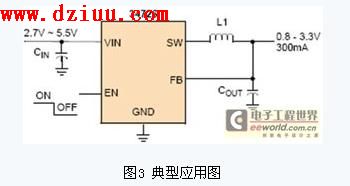 在300mA/600mA的持續負載電流中提供0.8~3.3V的輸出電壓。此外,其2MHz或4MHz的高交換頻率也使得它非常適合空間受限的便攜式器件,如手機、PDA、DSC、PND、GPS、PMP和其他便攜式儀器。圖3顯示的是該器件的一個典型應用。