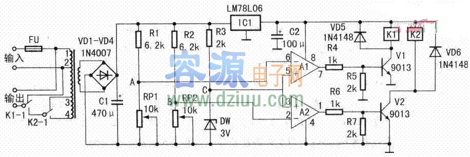 A1、A2為運(yùn)算放大器,在這里作電壓比較器用;IC1為三端穩(wěn)壓塊,為運(yùn)算放大器及繼電器提供供電電源;VD5、VD6為保護(hù)二極管。 <<版權(quán)聲明:本文由容源電子網(wǎng)(www_dziuu_com)整理提供,部分內(nèi)容來(lái)源于網(wǎng)絡(luò),如有侵犯到你的權(quán)利請(qǐng)與我們聯(lián)系更正!