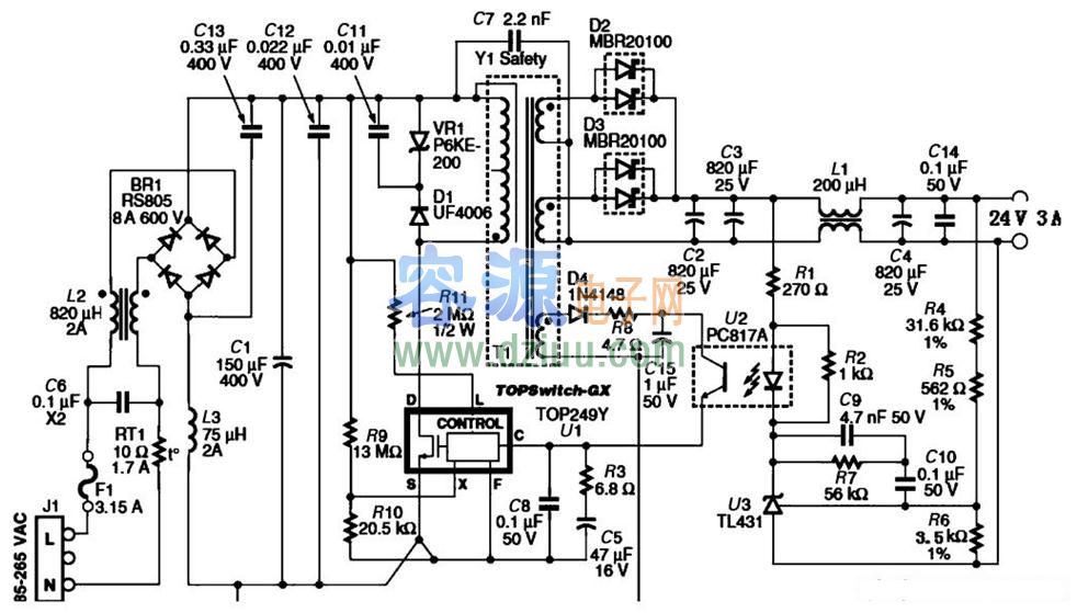 TOP249Y 在本電路中的直流電壓范圍為100~ 450 V,一旦超出了該電壓范圍,TOP249Y 將自動關閉。電阻R 10使用20. 5 K 電阻值從外部將流限值設定為僅略高于低電壓工作時的滿載峰值電流,從而允許使用更小的變壓器磁芯,