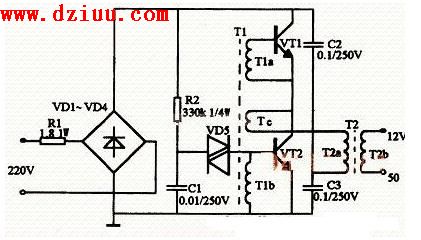 。其工作原理與開關(guān)電源相似,二極管VD1~VD4構(gòu)成整流橋把市電變成直流電,由振蕩變壓器T1,三極管VT1、VT2組成的高頻振蕩電路,將脈動(dòng)直流變成高頻電流,然后由鐵氧體輸出變壓器T2對(duì)高頻高壓脈沖降壓,獲得所需的電壓和功率。R1為限流電阻。電阻R2、電容C1和雙向觸發(fā)二極管VD5構(gòu)成啟動(dòng)觸發(fā)電路。