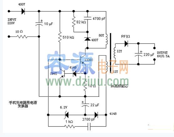 推遲開關的導通,從而控制了能量輸入到變壓器中,也就控制了輸出電壓的升高,實現了穩壓輸出的功能。而下方的1KΩ電阻跟串聯的2700pF電容,則是正反饋支路,從取樣繞組中取出感應電壓,加到開關管的基極上,以維持振蕩。右邊的次級繞組就沒有太多好說的了,經二極管RF93整流,220uF電容濾波后輸出6V的電壓。 容-源-電-子-網-為你提供技術支持