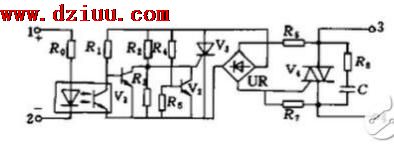 。1、2為輸入端,3、4為輸出端。R0為限流電阻,光耦合器將輸入與輸出電路在電氣上隔離開,V1構成反相器,R4、R5、V2和晶閘管V3組成過零檢測電路,UR為雙向整流橋,由V3和UR用以獲得使雙向晶閘管V4開啟的雙向觸發脈沖,R3、R7為分流電阻,分別用來保護V3和V4,R8和C組成浪涌吸收網絡,以吸收電源中帶有的尖峰電壓或浪涌電流,防止對開關電路產生沖擊或干擾。