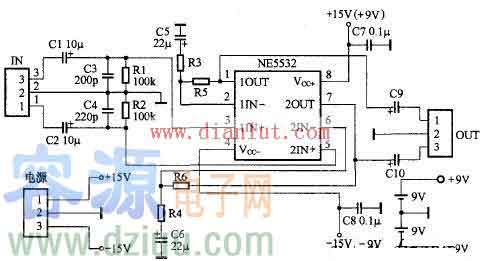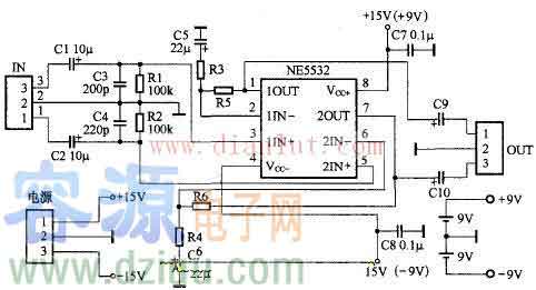 基于NE5532制作9V便攜式耳機放大器電路原理圖