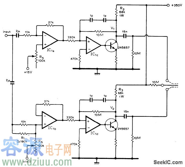 利用LM3900N四運放芯片和兩個晶體管加強AF功率放大器的耳機輸出信號以驅動沒有過度扭曲的一對靜電耳機。在300V的峰峰值輸出下1kHz總諧波失真為1%,在50V輸出時降為0.1%。 :