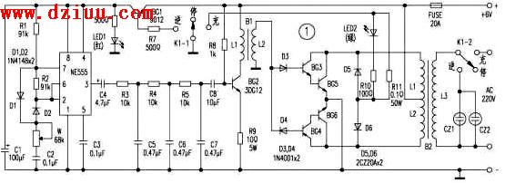 簡易自制家用逆變器電路圖一: 電路見圖1。當把開關K1打向“逆變”位置時,BG1導通,由時基電路NE555及外圍元件組成的無穩態多諧振蕩器開始振蕩,