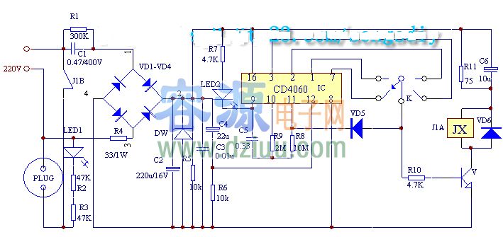 IC選用CD4060,晶體管V選用9014型,發光二極管為普通型,二極管VD1-VD4用IN4007,穩壓管為10V,二極管VD5、VD6選用IN4148型,繼電器J1選用HG4123,或