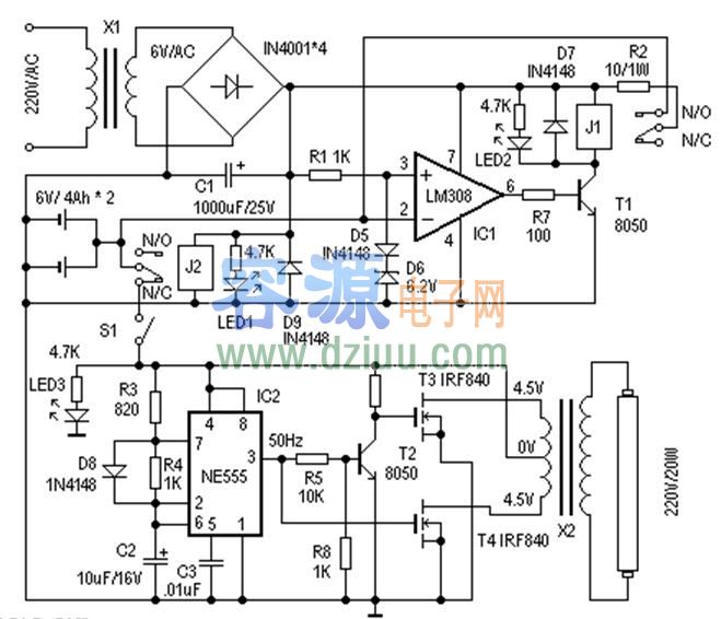 由IC2(NE555)、T2、T3、T4、X2等組成應急燈電路。IC2組成50Hz信號發生器,由IC2的3腳輸出50Hz信號,經T2反相、放大分別驅動由T3、T4、X2組成的推挽電路,在X2的高壓側感應出220V的交流電,使日光燈管點亮。這里的X2可以直接使用次級為4.5伏、初級為220V的成品電源變壓器,功率試日光燈管的功率而定。使用時,注意T3、T4應加散熱器。