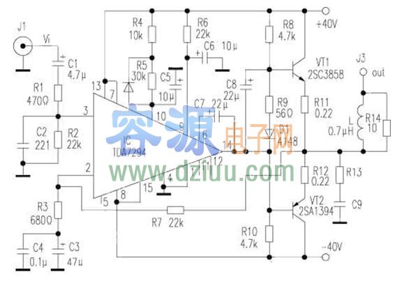 TDA7294電路圖,引腳功能說明 <<版權聲明:本文由容源電子網(www_dziuu_com)整理提供,部分內容來源于網絡,如有侵犯到你的權利請與我們聯系更正。》