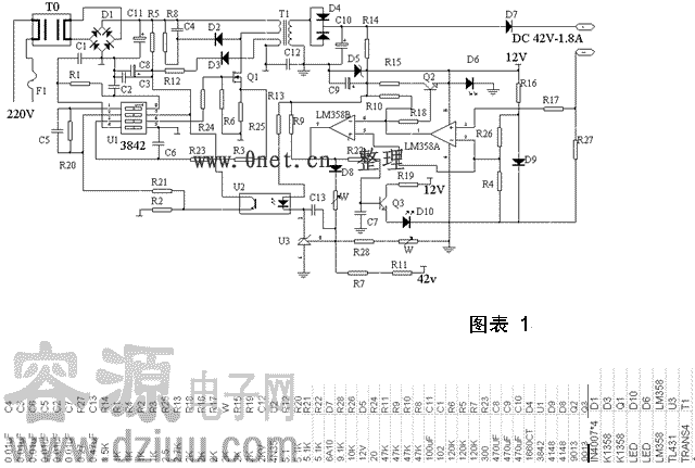 常用電動車充電器根據電路結構可大致分為兩種。第一種是以uc3842驅動場效應管的單管開關電源,配合lm358雙運放來實現三階段充電方式。其電原理圖和元件參數見(圖表1)