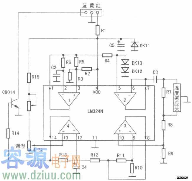 另外,亞都YC-D22還有自動恒濕控制電路,如下圖所示。它以LM324N四運算放大器為主體,傳感器為“濕度感應頭”,組成比較電路。濕度感應探頭根據空氣中的濕度得到濕度電信號,與基準電壓相比較,得出“比較電壓”,去控制調整管C9014的偏置電流,也就是控制C9014內阻的大小,經拔插線排中的藍線,去控制振蕩管BU406的B極偏置電流,即控制換能器的振蕩幅度,也就是控制了蒸發量,達到溫度自控的目的。