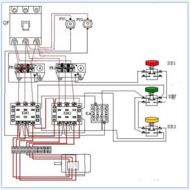 5、此控制回路中SB2的常開觸點與KM1線圈串聯,SB2的常閉觸點與KM2線圈串聯,同樣SB3按鈕的常閉觸點與KM1線圈串聯,SB3的常開于KM2線圈串聯,這種控制就是按鈕的互鎖控制,保證△與YY兩種接法不可能同時出現,同時KM2輔助常閉觸點接入KM1線圈回路,KM1輔助常閉觸點接入KM2線圈回路,也形成互鎖控制。雙速電機控制電路接線圖.