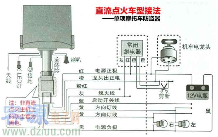 直流點火車型接法(雙項摩托車防盜器)