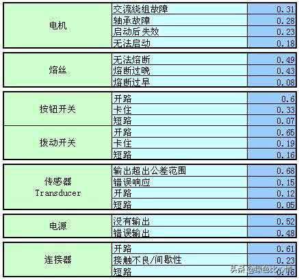 常用電子元器件故障分布 這里總結(jié)摘錄MIL-HDBK-338B,美軍可靠性設(shè)計手冊來為FTA做一些支持,這里按照以下的方式介紹: 如果我們想要進行FTA的定量分析,一定要把可靠