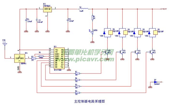 英文翻譯結果:電路圖如圖1所示。由電路,無線接收部分主要供應的一部分,數據解碼部分和開關控制元件。直流12V電源輸入接收器,一路到繼電器電源供應,以及其他通過三端穩壓器調節,在5V工作電壓的輸出,作為無線接收器和解碼部分的電源部分。